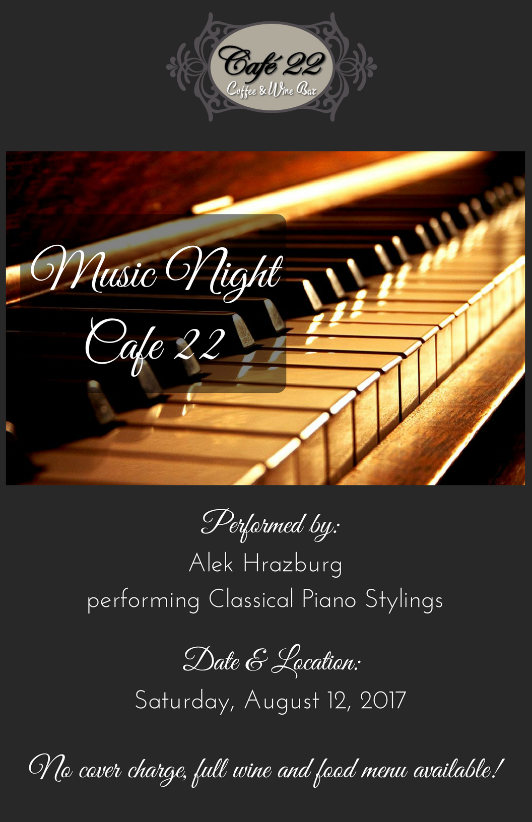 Aug 12 7:00 PM19:00 August Music Night Saturday, August 12, 2017 7:00 PM 10:00 PM 19:00 22:00 Cafe 22 (map) Google Calendar ICS View Event →